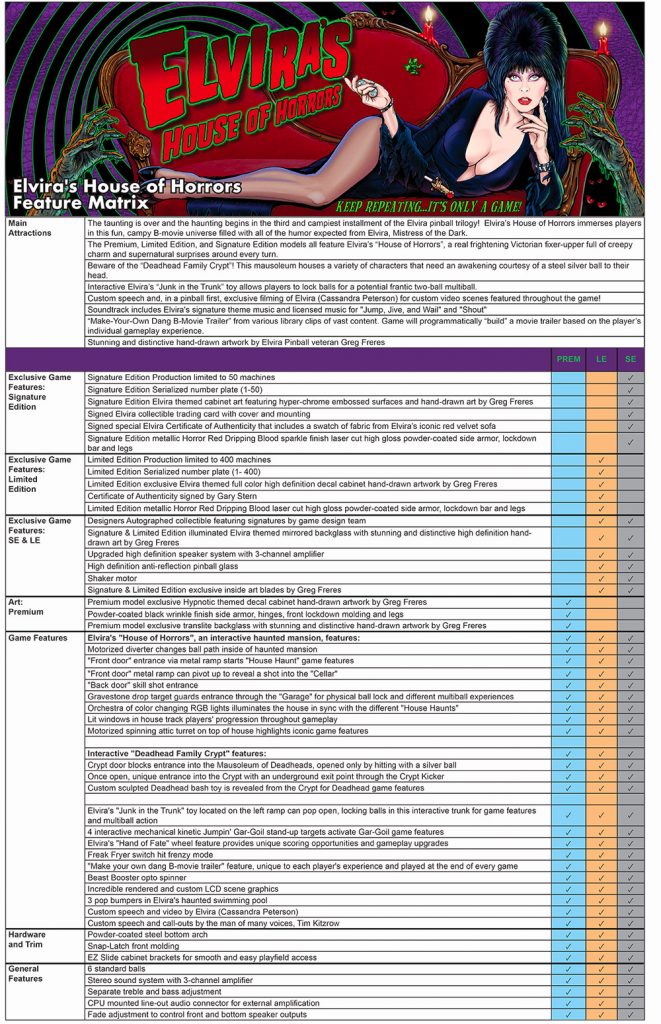 Το δεύτερο από τα 3 μοντέλα της σειράς ELVIRA HOUSE OF HORROR σε έκδοση LIMITED EDITION . Με αμείωτο ενδιαφέρον στο παίξιμο του παιχνιδιού και φυσικά με την στιβαρότητα και την ποιότητα του επαγγελματικού φλίπερ από την STERN .Φυσικά συνδυάζονται με τα πιο σύγχρονα συστήματα για μείωση προβλημάτων καθώς και led φωτισμούς και χειροποίητα γραφικά ,επίσης υπάρχουν 400 σκηνές βίντεο που εναλλάσσονται κατά την διάρκεια του παιχνιδιού