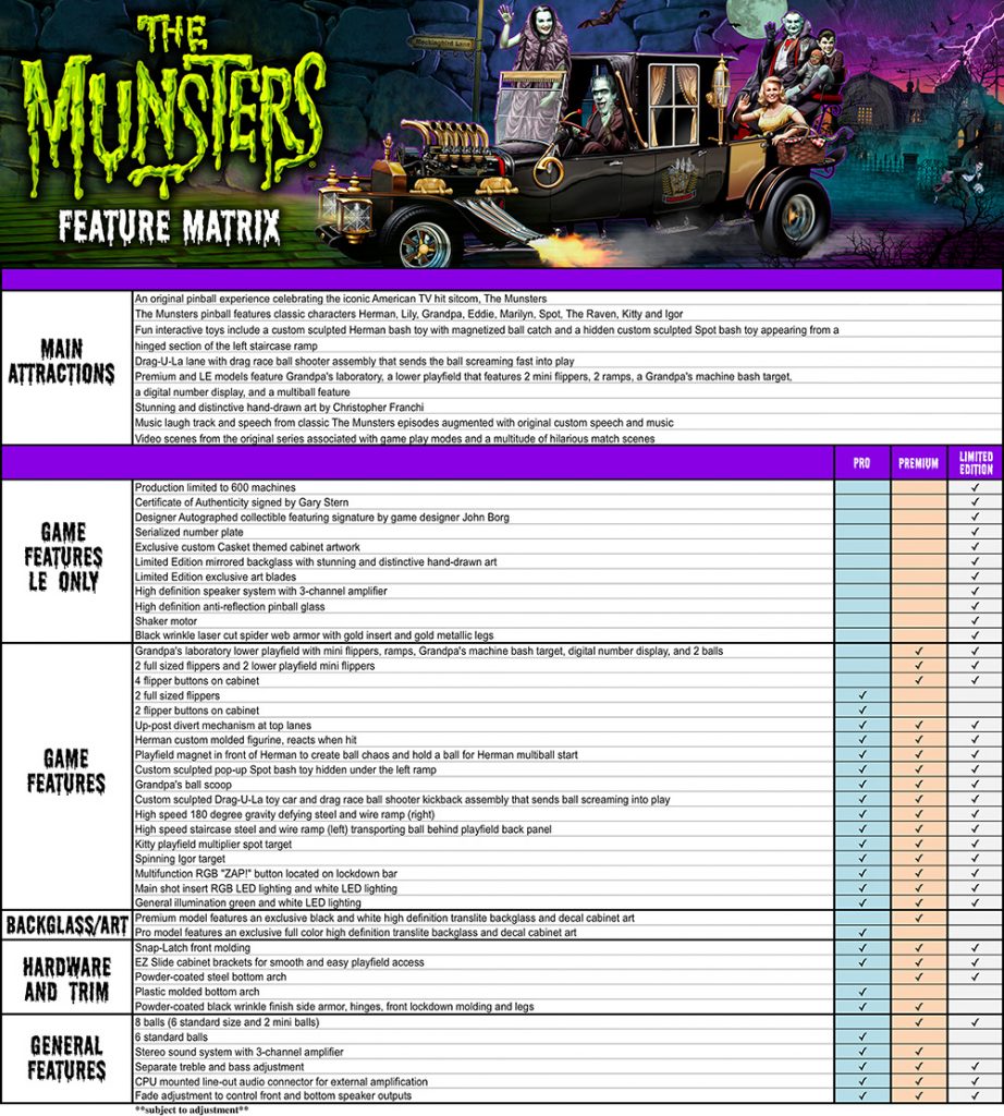 Το δεύτερο από τα 3 μοντέλα της σειράς FAMILY MUNSTERS σε έκδοση PREMIUM . Με αμείωτο ενδιαφέρον στο παίξιμο του παιχνιδιού και φυσικά με την στιβαρότητα και την ποιότητα του επαγγελματικού φλίπερ από την STERN .Φυσικά όπως όλα τα STERN PINBALL συνδυάζονται με τα πιο σύγχρονα συστήματα για μείωση προβλημάτων , συνεχή updates λογισμικού καθώς και led rgb φωτισμούς και χειροποίητα γραφικά .