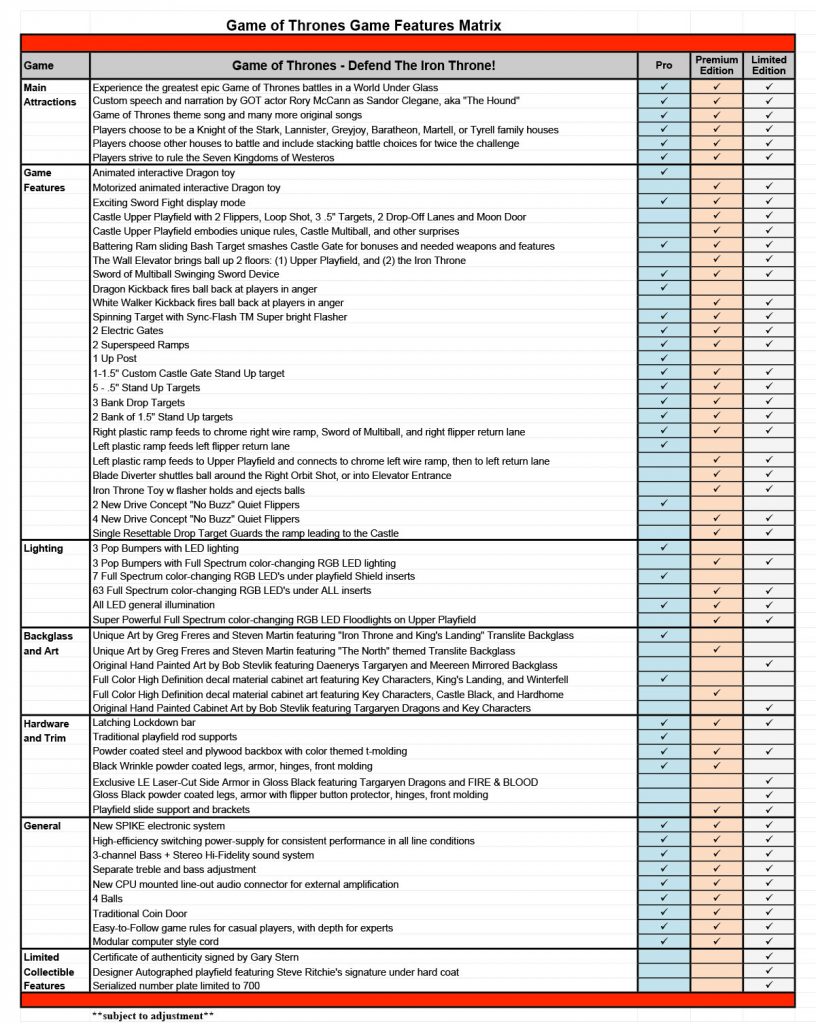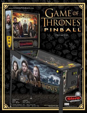 Το πρώτο απο τα 3 μοντέλα της σειράς GAME OF THRONES σε έκδοση PRO . Με αμείωτο ενδιαφέρον στο παίξιμο του παιχνιδιού και φυσικά με την στιβαρότητα και την ποιότητα του επαγγελματικού φλιππερ απο την STERN .Φυσικά συνδιάζονται με τα ποιό συγχρονα συστήματα για μείωση προβλημάτων καθώς και led φωτισμούς και χειροποίητα γραφικά ,επίσης υπάρχουν σκηνες βίντεο που εναλάσσονται κατα την διάρκεια του παιχνιδιού , ράμπα χαραγμένη με LASER , και πολλα ακόμα …