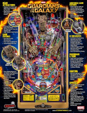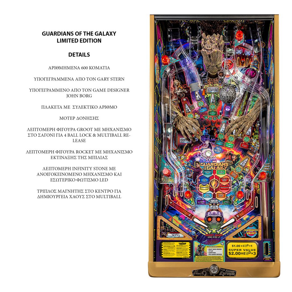 Το τρίτο από τα 3 μοντέλα της σειράς GUARDIANS OF GALAXY σε έκδοση LIMITED EDITION . Με αμείωτο ενδιαφέρον στο παίξιμο του παιχνιδιού και φυσικά με την στιβαρότητα και την ποιότητα του επαγγελματικού φλίπερ από την STERN .Φυσικά όπως όλα τα STERN PINBALL συνδυάζονται με τα πιο σύγχρονα συστήματα για μείωση προβλημάτων , συνεχή updates λογισμικού καθώς και led rgb φωτισμούς και χειροποίητα γραφικά αριθμημένα 600 κομμάτια για όλο τον κόσμο